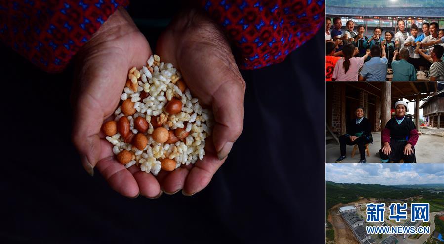 拼版照片:左圖為在廣西融水雙龍溝森林旅游度假區(qū)夢嗚苗寨,70歲的韋院媽手捧油茶原料:花生、油果、蔭米(11月20日攝);右上圖為韋院媽(左六)在景區(qū)里和游客們一起歡度苗族新禾節(jié)(7月18日攝);右中圖為韋院媽(右)在家里休息(11月20日攝);右下圖為夢嗚苗寨(7月19日無人機拍攝)。韋院媽是桿洞鄉(xiāng)錦洞村的貧困戶,今年3月,她和村里的13戶貧困戶一起舉家搬到雙龍溝森林旅游度假區(qū)打造的夢嗚苗寨,景區(qū)將貧困戶引入苗寨生活工作,保證貧困家庭有穩(wěn)定的收入。 廣西融水苗族自治縣是國家扶貧工作重點縣,全縣“九山半水半分田”,生活生產(chǎn)環(huán)境較為惡劣,脫貧攻堅任務艱巨,目前還有7.68萬貧困人口。面對經(jīng)濟發(fā)展落后、貧困面廣且程度深的現(xiàn)狀,當?shù)匕衙撠毠耘c創(chuàng)新產(chǎn)業(yè)扶持相結(jié)合,依托生態(tài)資源優(yōu)勢,實施“特色產(chǎn)業(yè)富民行動”,通過發(fā)展特色民族旅游、林下經(jīng)濟和特色養(yǎng)殖業(yè)等扶貧產(chǎn)業(yè),帶動貧困群眾依靠勤勞的雙手,拔窮根摘窮帽,實現(xiàn)脫貧致富。據(jù)了解,目前全縣貧困戶參與特色產(chǎn)業(yè)發(fā)展的有2.9萬戶,扶貧產(chǎn)業(yè)覆蓋率達95%。 新華社記者 黃孝邦 攝