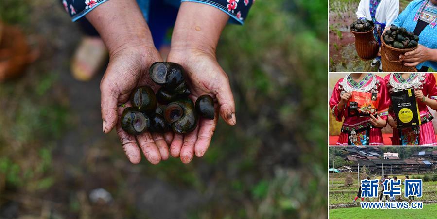 拼版照片:左圖為在拱洞鄉(xiāng)龍令村,貧困戶龍亞手捧剛剛收獲的田螺(11月17日攝);右上圖為龍亞展示收獲的田螺(11月17日攝);右中圖為龍令村養(yǎng)殖的田螺已經成為柳州螺螄粉的原材料(10月28日攝);右下圖為龍亞(右一)在稻田里撈田螺(11月17日攝)。今年,拱洞鄉(xiāng)大力發(fā)展稻田養(yǎng)螺產業(yè),目前,全鄉(xiāng)田螺養(yǎng)殖面積突破4000畝,參與的貧困農戶有600多戶。 廣西融水苗族自治縣是國家扶貧工作重點縣,全縣“九山半水半分田”,生活生產環(huán)境較為惡劣,脫貧攻堅任務艱巨,目前還有7.68萬貧困人口。面對經濟發(fā)展落后、貧困面廣且程度深的現狀,當地把脫貧攻堅與創(chuàng)新產業(yè)扶持相結合,依托生態(tài)資源優(yōu)勢,實施“特色產業(yè)富民行動”,通過發(fā)展特色民族旅游、林下經濟和特色養(yǎng)殖業(yè)等扶貧產業(yè),帶動貧困群眾依靠勤勞的雙手,拔窮根摘窮帽,實現脫貧致富。據了解,目前全縣貧困戶參與特色產業(yè)發(fā)展的有2.9萬戶,扶貧產業(yè)覆蓋率達95%。 新華社記者 黃孝邦 攝