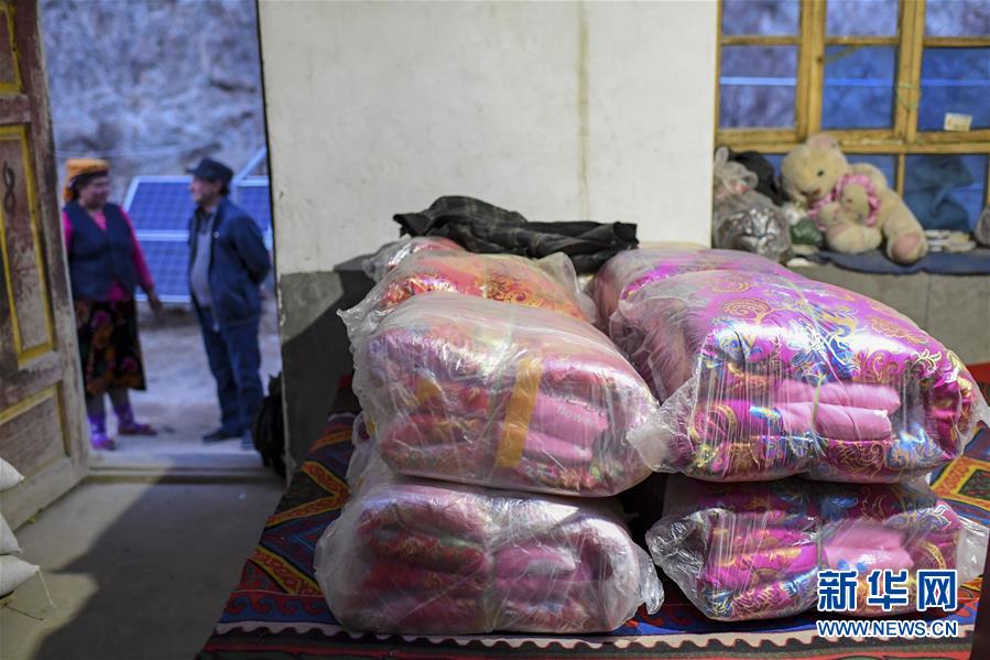 在塔什庫爾干塔吉克自治縣大同鄉(xiāng)阿克托尕欄桿村一組都熱的舊居中,新縫制好的12床被子放在屋內(nèi),都熱·加爾曼(右)和妻子在門口談?wù)摪徇w安排(11月16日攝)。新華社記者胡虎虎攝