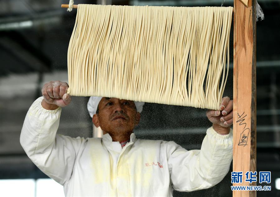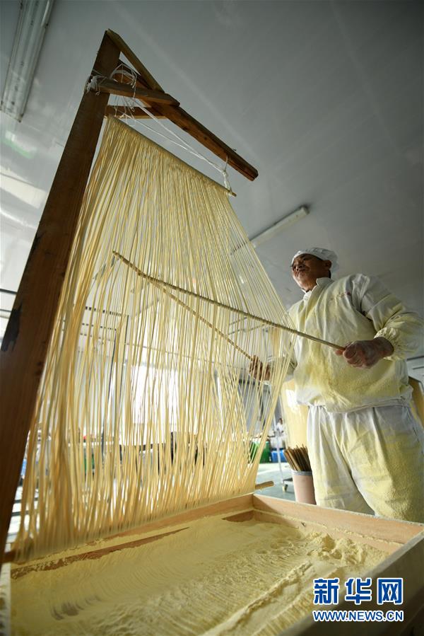 11月23日,在石家莊市藁城區(qū)耿家莊村某宮面生產(chǎn)廠,工人演示用空心的藁城宮面吹水泡。