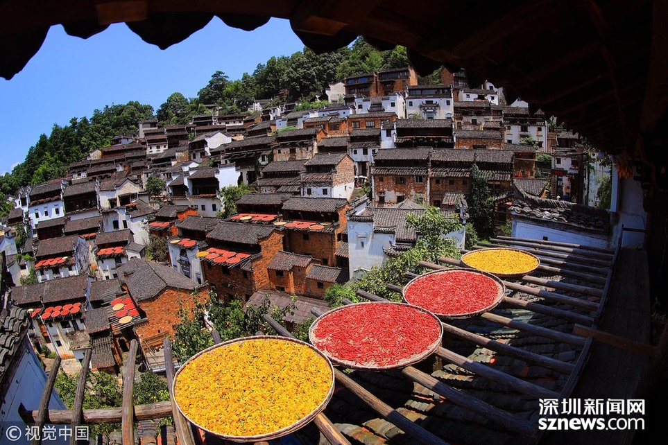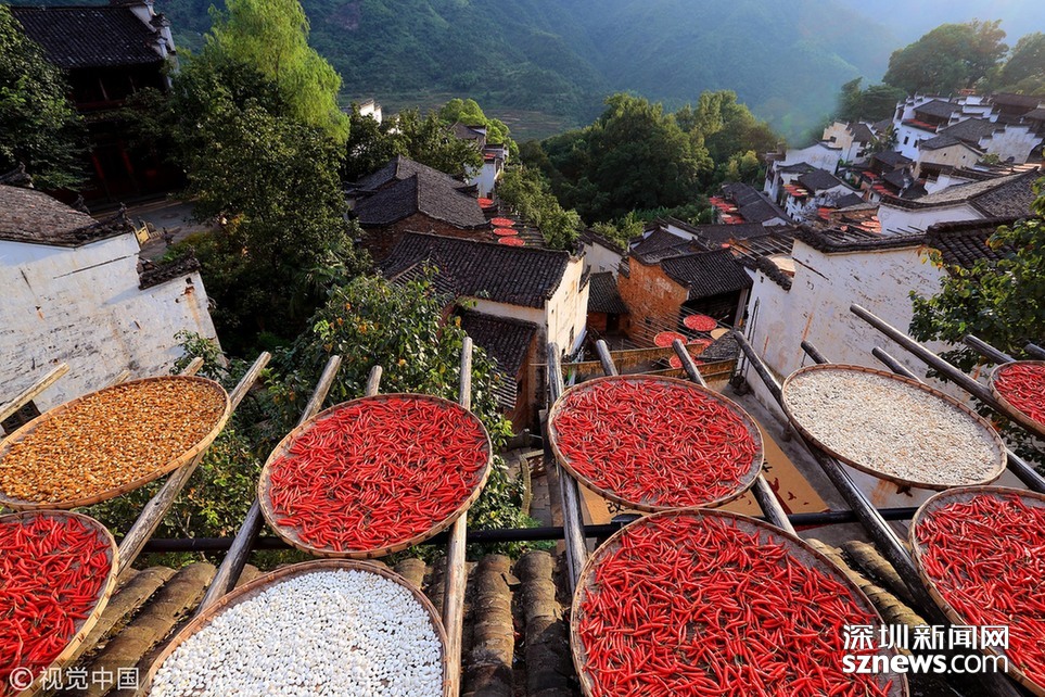 深圳新聞網(wǎng)訊 2018年8月7日,江西婺源縣篁嶺古村落,壯觀“曬秋”場景。當(dāng)日立秋節(jié)氣,江西婺源縣篁嶺古村的農(nóng)作物普遍豐收,村民們又迎來了一年一度的“曬秋”季。村民們將收獲來的紅辣椒、玉米、南瓜、稻谷和菊花等色彩斑斕的農(nóng)作物,晾曬在依山而建的徽派民居房前屋后的木制曬架上,在秋日陽光的照射下,色彩繽紛圓圓的曬扁,鋪就在錯落有致的徽派民居之間,格外璀璨奪目,蔚為壯觀。目前,“篁嶺曬秋”已經(jīng)成為中國鄉(xiāng)村旅游的一張名片。