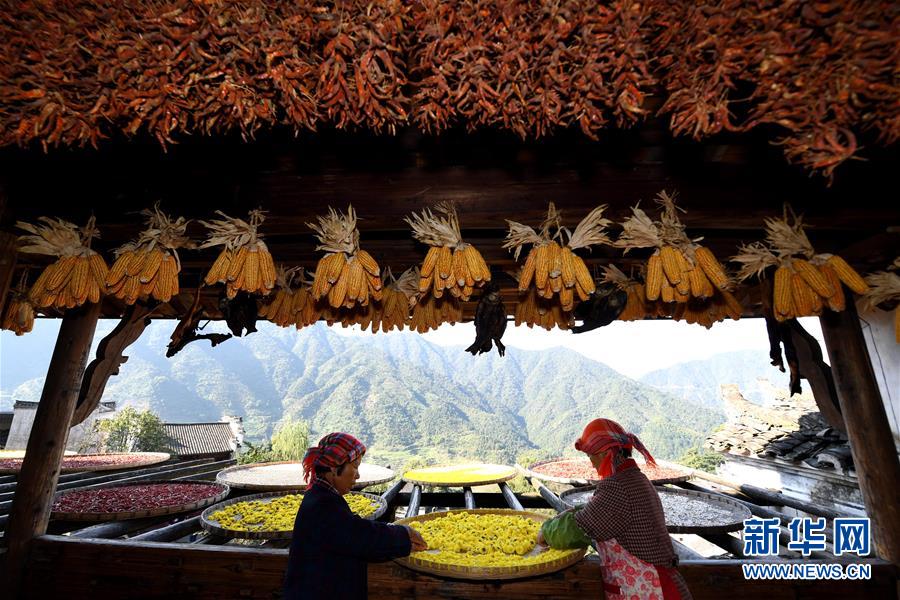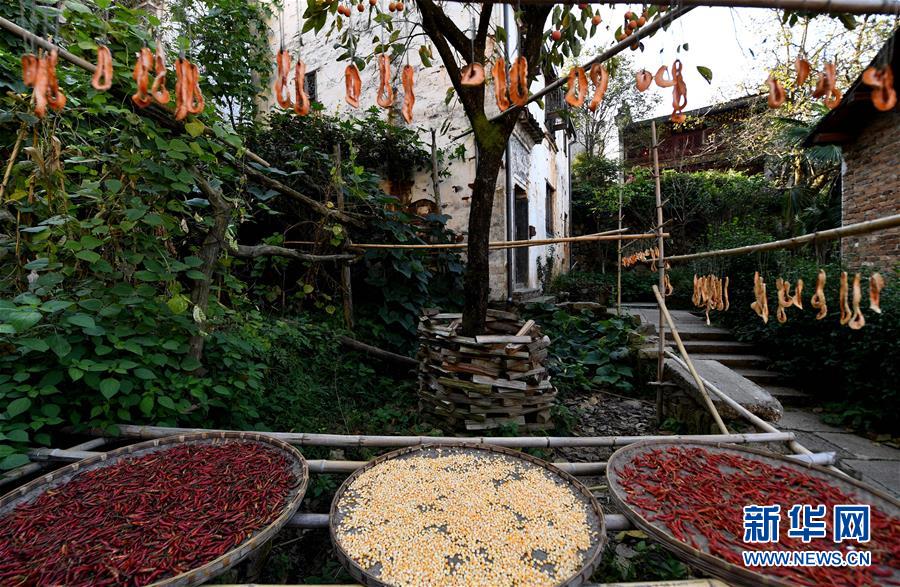2017年10月26日拍攝的篁嶺古村。家家戶戶晾曬各種蔬果及皇菊。近日天氣晴朗,江西省婺源縣江灣鎮(zhèn)篁嶺村村民抓住時機采摘、晾曬皇菊及蔬果。明黃的菊花、火紅的辣椒……各種顏色將篁嶺古村裝扮成巨大的“調(diào)色板”,引來眾多游客感受鄉(xiāng)村美景。新華社記者宋振平 攝