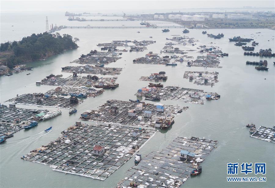 這是發(fā)生碳九泄漏事件的福建省泉州市泉港區(qū)南埔鎮(zhèn)肖厝村附近海域,漁排上鋪設(shè)了吸油氈(11月6日無(wú)人機(jī)拍攝)。