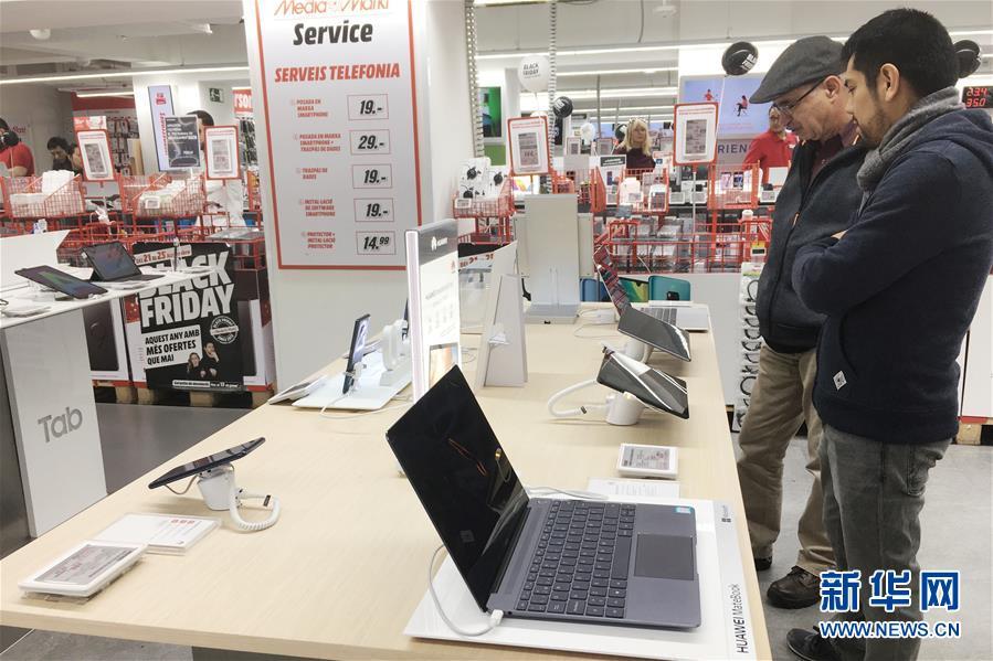11月25日,顧客在西班牙巴塞羅那的一家電子用品商場(chǎng)選購(gòu)華為智能電子產(chǎn)品。新華社記者鄭煥松攝