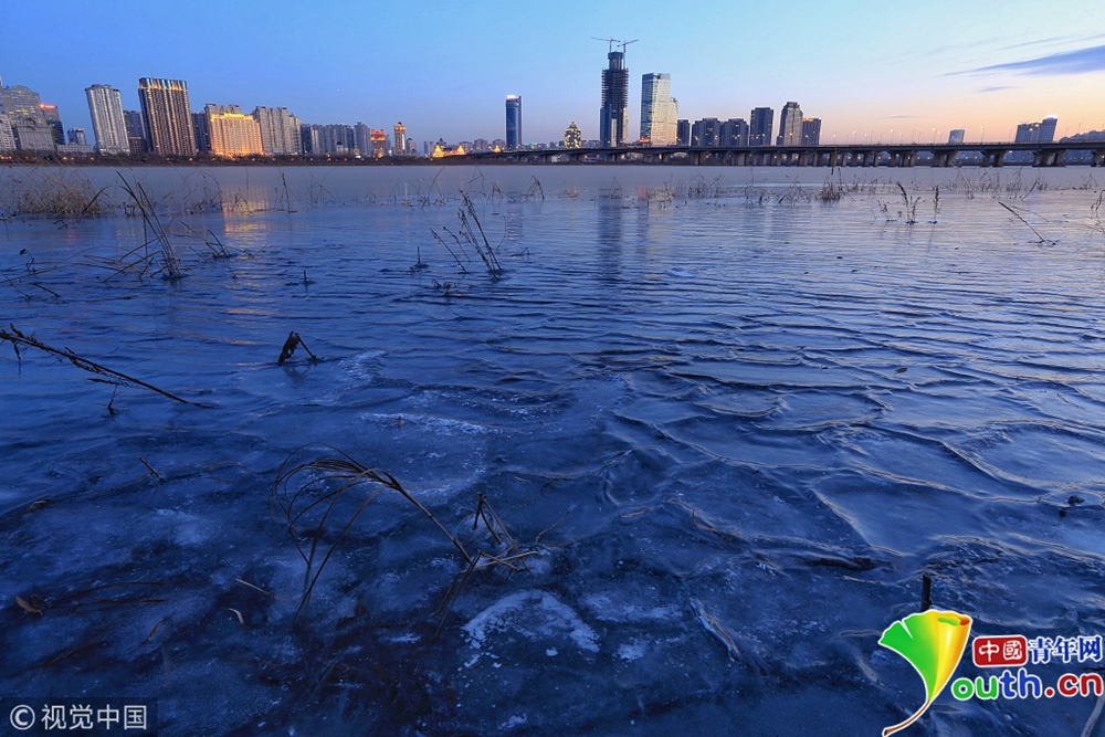 11月23日,黑龍江省哈爾濱市,松花江城區(qū)江段今日封江,江面如鏡,倒影著冰城靚麗的夜色。