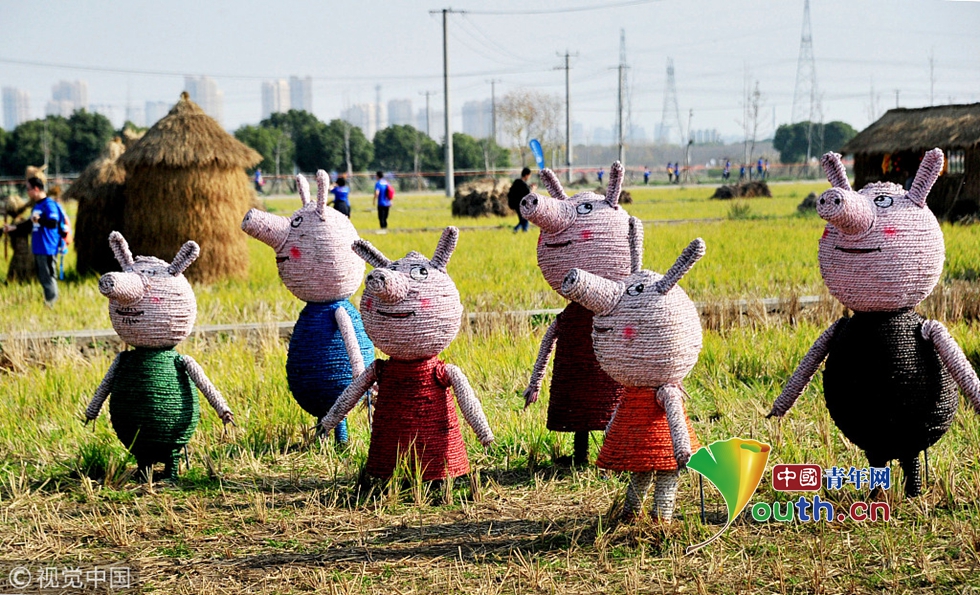 2018年12月1日,上海。上海嘉北郊野公園的一片農(nóng)田近日成了“網(wǎng)紅”。在這片收割過(guò)的早稻田里,小豬佩奇、獅子、大象等20多個(gè)稻草雕塑在農(nóng)田中安營(yíng)扎寨。圖片來(lái)源視覺(jué)中國(guó)