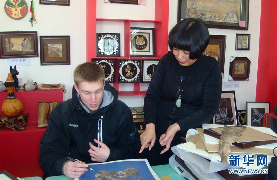 張琳在位于哈爾濱的工作室指導(dǎo)前來參觀學(xué)習(xí)的外國學(xué)生制作魚皮畫(2011年3月20日攝)。國家級非物質(zhì)文化遺產(chǎn)赫哲族魚皮制作技藝是我國赫哲族傳統(tǒng)手工藝術(shù)。作為這項(xiàng)技藝的黑龍江省級傳承人,十余年來,張琳一直從事魚皮畫的研究和創(chuàng)作,并通過做推廣、開講座、辦活動,讓更多年輕人了解并喜歡上這一傳統(tǒng)手工藝,將這項(xiàng)瀕臨失傳的藝術(shù)更好地傳承下去。新華社發(fā)