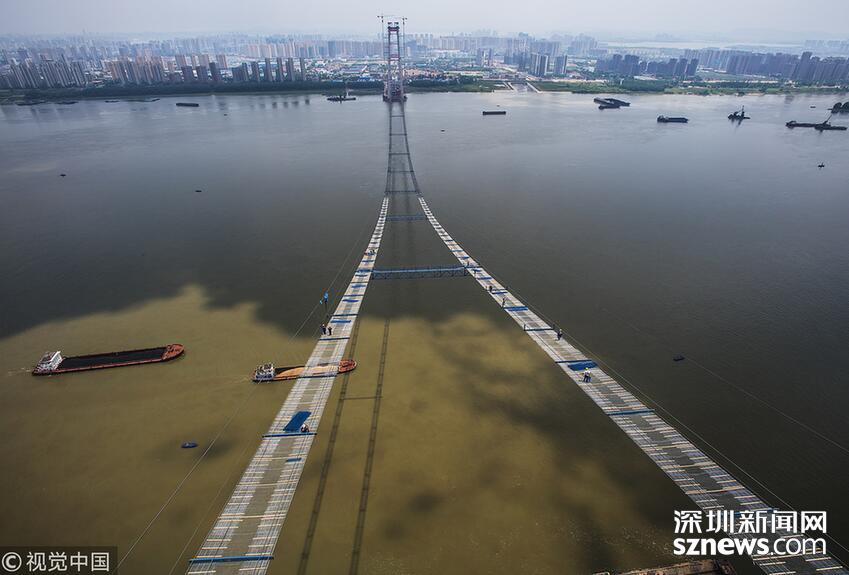 2018年5月14日,武漢,武漢楊泗港長(zhǎng)江大橋上空,上部結(jié)構(gòu)施工進(jìn)入貓道面網(wǎng)鋪設(shè)階段,數(shù)十名中鐵大橋局工人在跨江高空拼搏趕超,江面上空的臨時(shí)“吊橋”悄然形成。數(shù)十名工人在長(zhǎng)江上空228米處拼搏趕超,臨時(shí)“天梯”悄然形成。