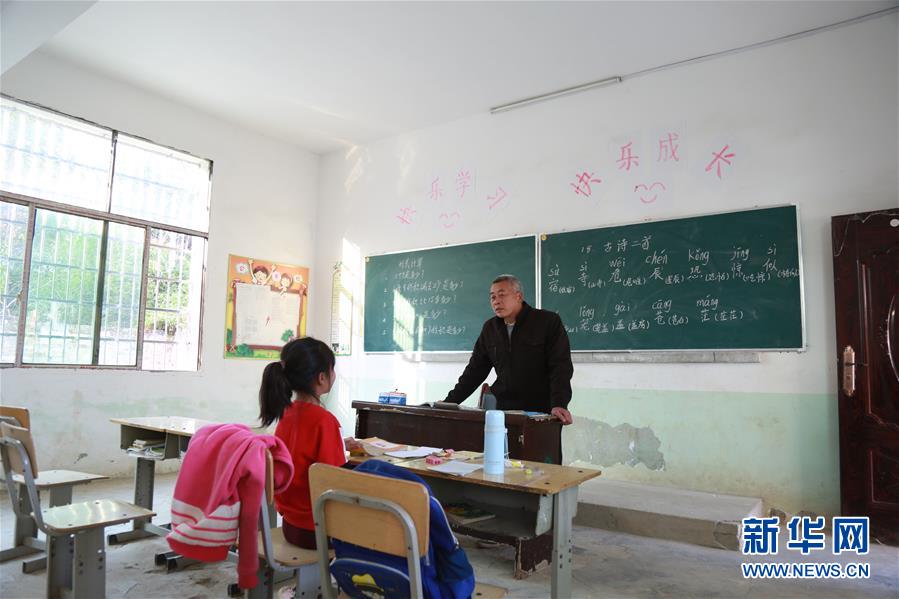11月29日,在湖南省永州市冷水灘區(qū)黃陽(yáng)司鎮(zhèn)天里坪村小學(xué)教學(xué)點(diǎn),55歲的唐炳元在給7歲的陳宏薈上課,該教學(xué)點(diǎn)只有一名老師一名學(xué)生。 55歲的唐炳元已是滿頭白發(fā),他身后的墻壁上有兩塊黑板,一塊寫著數(shù)學(xué)題,一塊寫著漢字和拼音??帐幍慕淌覂?nèi),只擺有4張課桌。在今年上半年,班上還有4名學(xué)生,到下半年就只剩下1名了。