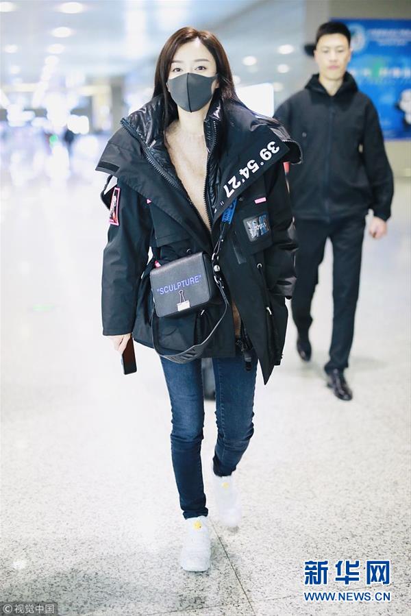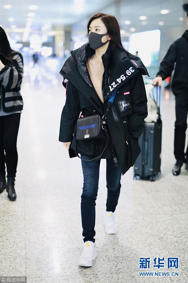 2018年12月3日,上海,秦嵐亮相機場。潮味棉服亮相機場變酷女孩,口罩遮面露甜笑心情靚。(圖片來源:視覺中國)