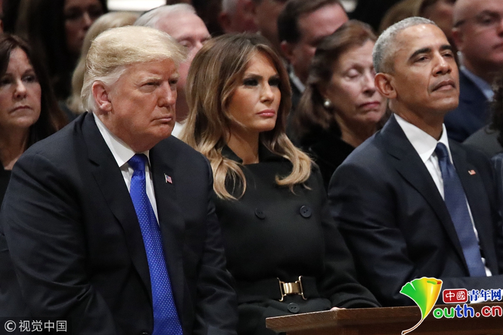 布什家族成員、現(xiàn)任總統(tǒng)特朗普、前總統(tǒng)奧巴馬等美國政界人士以及多名國際政要出席,為老布什送行。