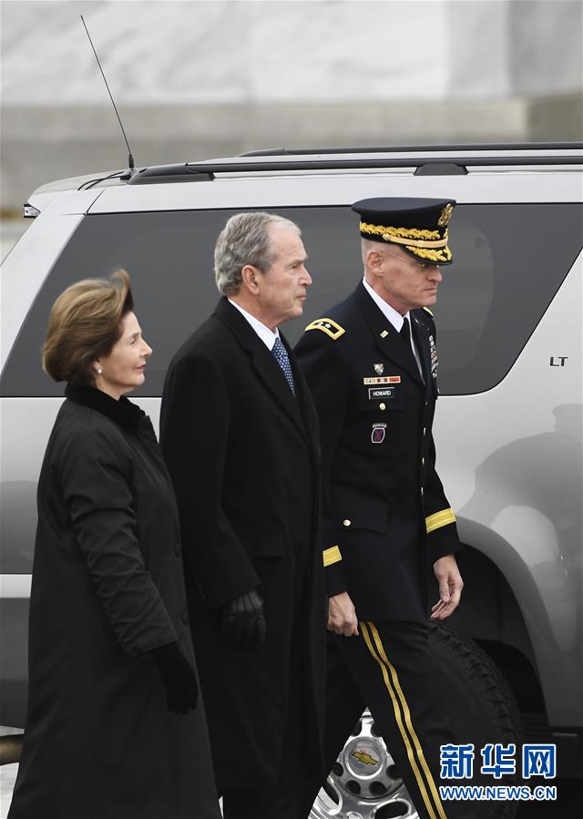 12月5日,在美國首都華盛頓,美國前總統(tǒng)喬治·沃克·布什(中)與夫人勞拉(左)抵達國會東廣場。