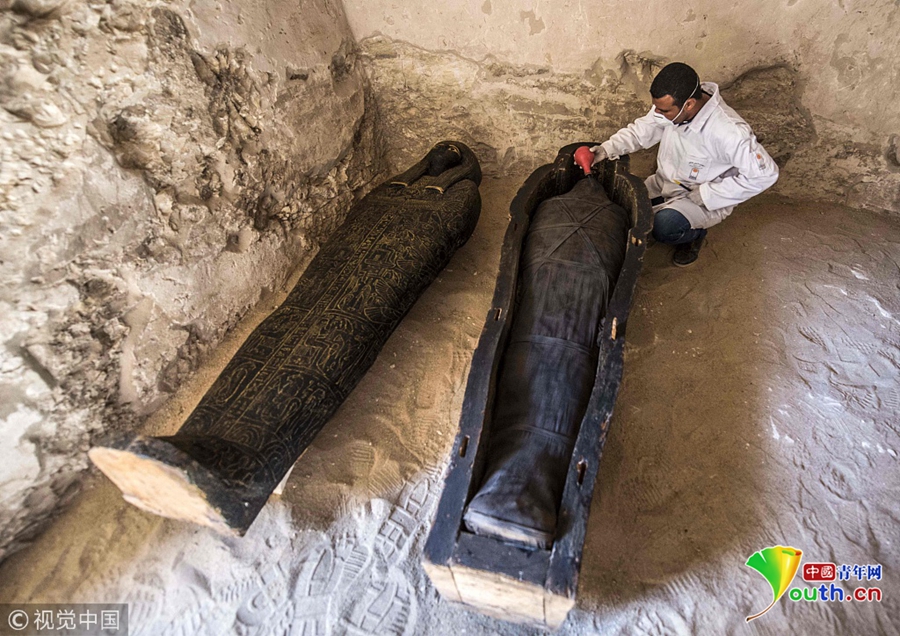 當?shù)貢r間2018年11月24日,埃及盧克索,考古學家在當?shù)匕l(fā)掘出一處墓穴,在其中發(fā)現(xiàn)石棺、木乃伊等文物,時間可追溯至公元前4-7世紀。圖片來源:視覺中國