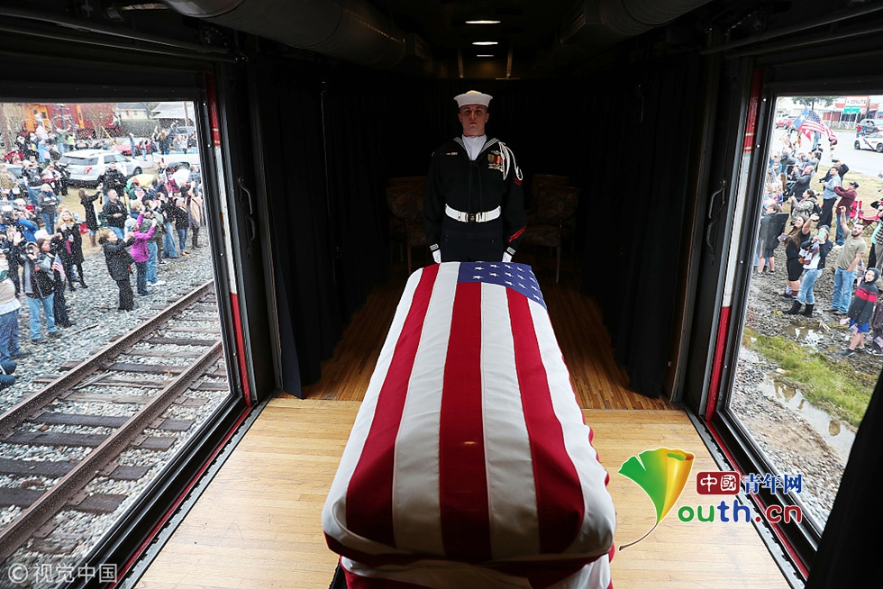 當(dāng)?shù)貢r間2018年12月6日,美國德州,美國前總統(tǒng)老布什將落葬德州農(nóng)機(jī)大學(xué)布什總統(tǒng)圖書館和博物館后面的布什家族墓地,與他半年前去世的妻子芭芭拉以及早夭的女兒蘿賓葬在一起。當(dāng)天,一輛葬禮專列將載著老布什的棺槨及其親朋,從休斯敦郊區(qū)開往老布什的最后安葬之地、德州農(nóng)機(jī)大學(xué)。這列火車的第六節(jié)車廂側(cè)面是透明的,人們可以在鐵軌旁看到老布什蓋著國旗的靈樞。圖片作者:Joe Raedle/視覺中國