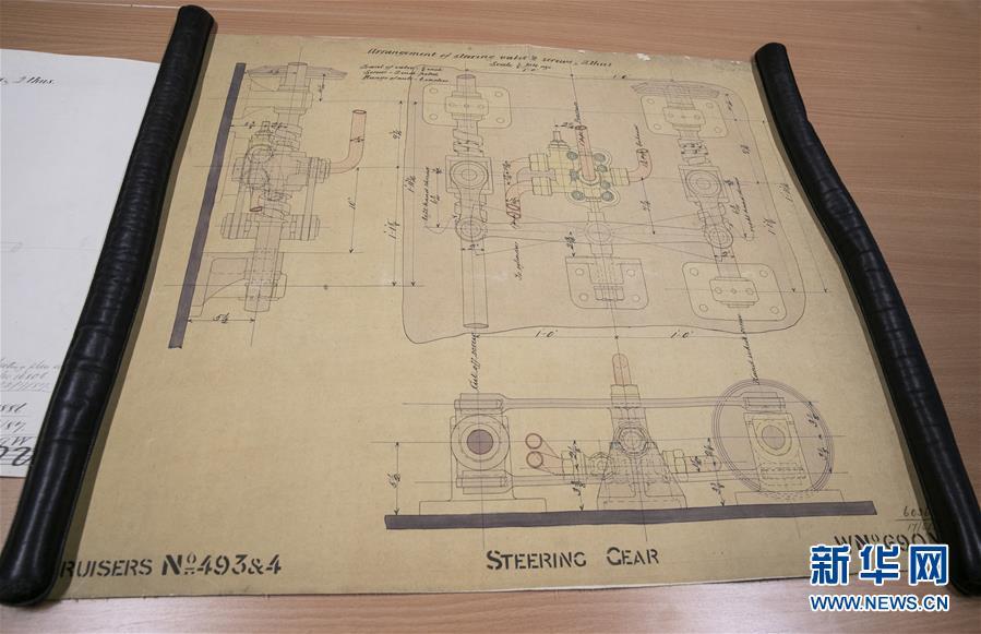 這是11月2日在英國紐卡斯?fàn)柕奶┒鳌枡n案館拍攝的致遠(yuǎn)艦設(shè)計(jì)圖紙。 新華社記者日前在紐卡斯?fàn)柼┒鳌枡n案館查找北洋海軍史料時發(fā)現(xiàn)一套七張、檔案名為“中國巡洋艦舵機(jī)設(shè)計(jì)圖”的原始圖紙。塵封百年,甲午海戰(zhàn)中抗擊日艦后沉沒的清北洋海軍致遠(yuǎn)艦部分原廠設(shè)計(jì)圖紙?jiān)谄浣ㄔ斓亍~卡斯?fàn)柺械囊患覚n案館首次被發(fā)現(xiàn),為打撈那段悲壯的歷史提供了重要參考。 新華社記者 韓巖 攝