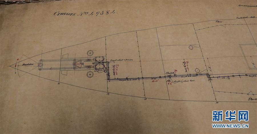 這是11月2日在英國(guó)紐卡斯?fàn)柕奶┒鳌枡n案館拍攝的致遠(yuǎn)艦設(shè)計(jì)圖紙。 新華社記者日前在紐卡斯?fàn)柼┒鳌枡n案館查找北洋海軍史料時(shí)發(fā)現(xiàn)一套七張、檔案名為“中國(guó)巡洋艦舵機(jī)設(shè)計(jì)圖”的原始圖紙。塵封百年,甲午海戰(zhàn)中抗擊日艦后沉沒(méi)的清北洋海軍致遠(yuǎn)艦部分原廠設(shè)計(jì)圖紙?jiān)谄浣ㄔ斓亍?guó)紐卡斯?fàn)柺械囊患覚n案館首次被發(fā)現(xiàn),為打撈那段悲壯的歷史提供了重要參考。 新華社記者 韓巖 攝