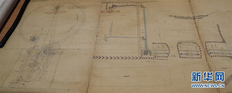這是11月2日在英國(guó)紐卡斯?fàn)柕奶┒鳌枡n案館拍攝的致遠(yuǎn)艦設(shè)計(jì)圖紙。 新華社記者日前在紐卡斯?fàn)柼┒鳌枡n案館查找北洋海軍史料時(shí)發(fā)現(xiàn)一套七張、檔案名為“中國(guó)巡洋艦舵機(jī)設(shè)計(jì)圖”的原始圖紙。塵封百年,甲午海戰(zhàn)中抗擊日艦后沉沒(méi)的清北洋海軍致遠(yuǎn)艦部分原廠(chǎng)設(shè)計(jì)圖紙?jiān)谄浣ㄔ斓亍?guó)紐卡斯?fàn)柺械囊患覚n案館首次被發(fā)現(xiàn),為打撈那段悲壯的歷史提供了重要參考。 新華社記者 韓巖 攝