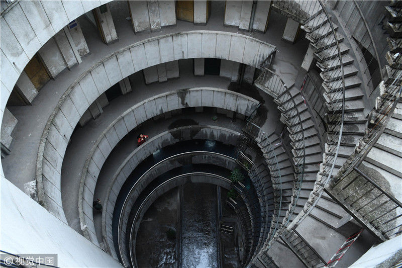 2018年12月6日,重慶江北紅旗河溝汽車站內(nèi),有一棟獨特的八層圓環(huán)狀建筑,底層每天有不少進出站的客車通行。據(jù)悉,這棟樓建于1990年,曾經(jīng)是車站旅館,如今一、二兩層用于車站辦公,其余樓層已廢棄。為確保安全,三層以上已經(jīng)被封鎖。圖為公交車穿過8層空心圓筒樓。徐勇/視覺中國