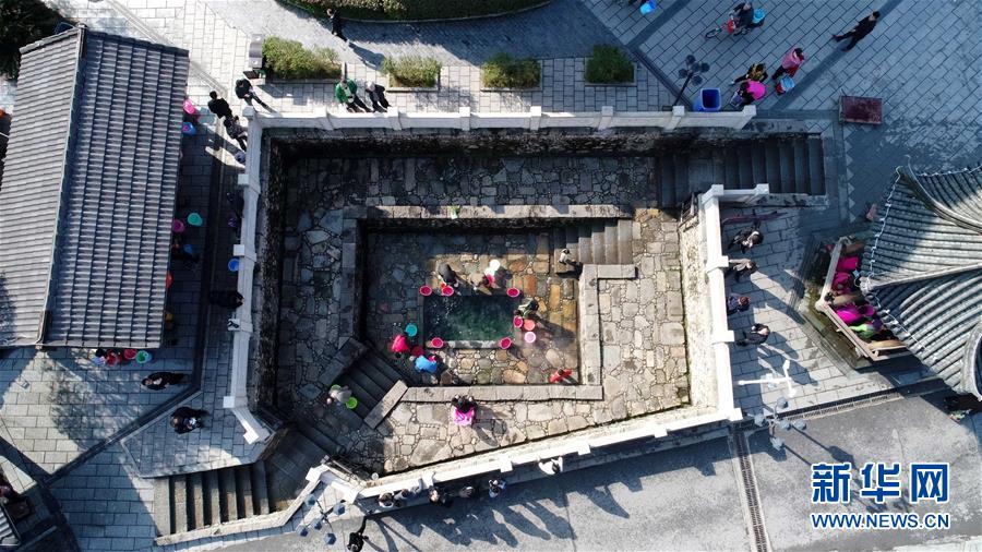 人們?cè)诮饕舜簻販?zhèn)的溫泉泉眼邊打水(2月28日無(wú)人機(jī)拍攝)。 新華社記者 彭昭之 攝