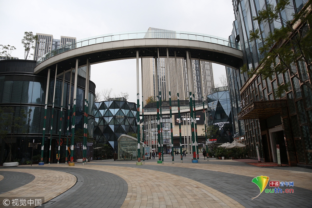2017年3月16日,重慶,渝中區(qū)一棟大樓從22層架起兩座平行的天橋,連接對(duì)面的魁星樓廣場(chǎng)地面。圖片來(lái)源:視覺中國(guó)