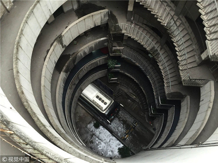 2017年9月27日,重慶,南岸區(qū)某小區(qū)的“螺旋”停車場(chǎng),從公路到車庫(kù)要下5層樓,司機(jī)需要轉(zhuǎn)無(wú)數(shù)個(gè)360度圈。圖片來(lái)源:視覺中國(guó)