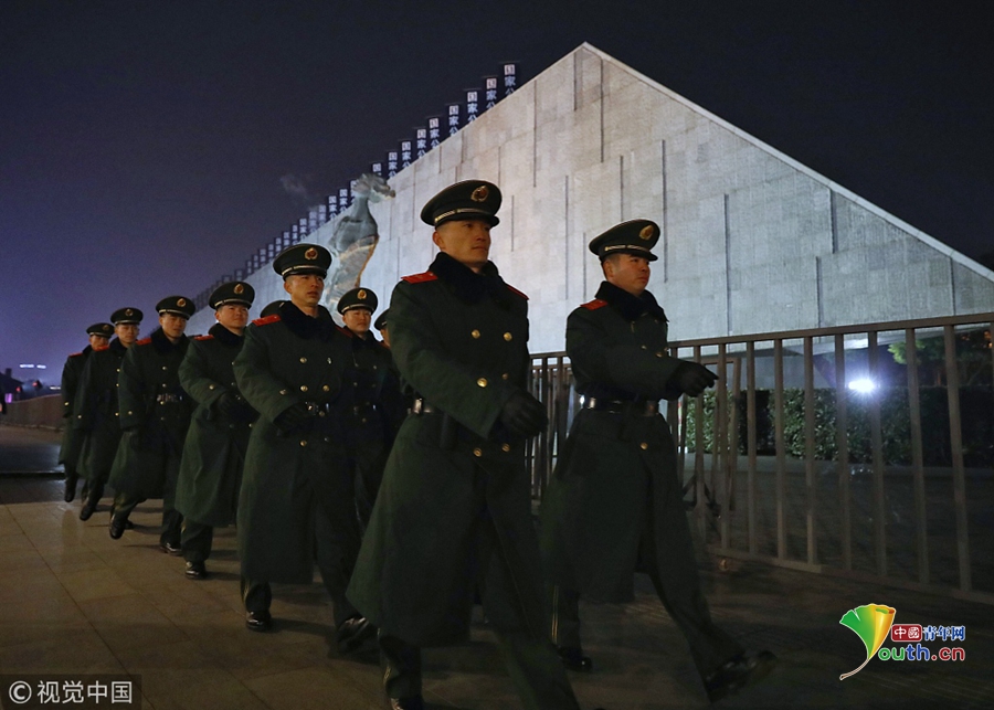2018年12月12日晚,江蘇南京,侵華日軍南京大屠殺遇難同胞紀(jì)念館沿線道路莊嚴肅穆、安保和工作人員做好了準(zhǔn)備,迎接第五個南京大屠殺死難者國家公祭日。2018年是南京大屠殺慘案發(fā)生81周年,第五個南京大屠殺死難者國家公祭儀式將于12月13日舉行。圖片作者:尼克