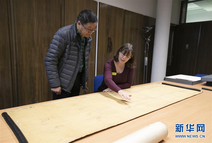 11月2日,在英國紐卡斯?fàn)柕奶┒鳌枡n案館,檔案管理員瑞秋·吉爾(右)向新華社記者介紹致遠(yuǎn)艦設(shè)計(jì)圖紙。 新華社記者 韓巖 攝