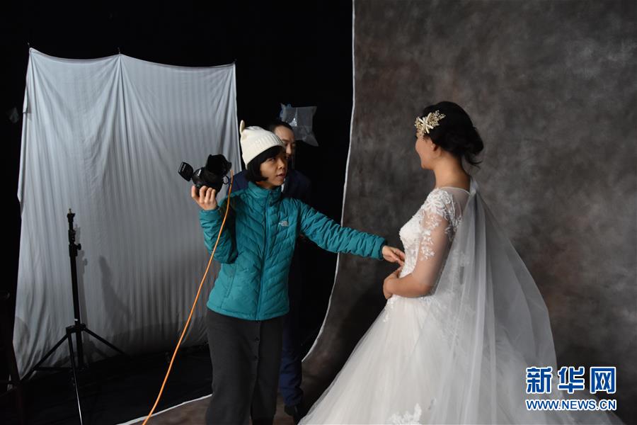 攝影師羅嫻在工地上搭建的臨時攝影棚內(nèi)指導(dǎo)農(nóng)民工夫妻擺姿勢(12月10日攝)。 新華社記者 白田田 攝