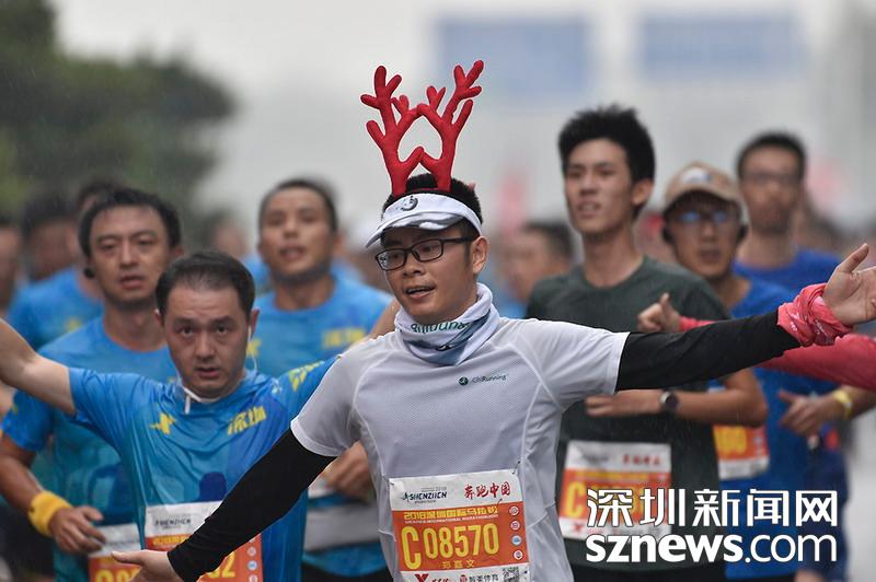 2018年12月16日,深圳國際馬拉松位于后海的折返點,一名頭戴圣誕鹿角頭箍的選手正在向終點沖刺。