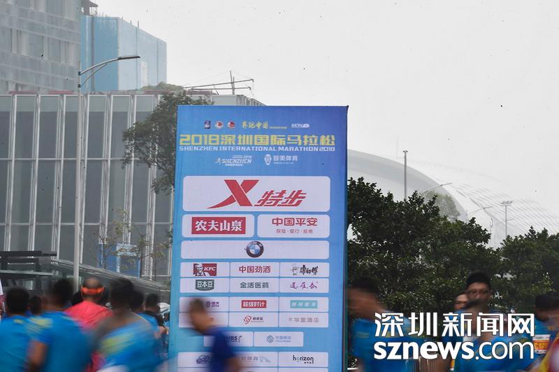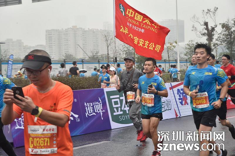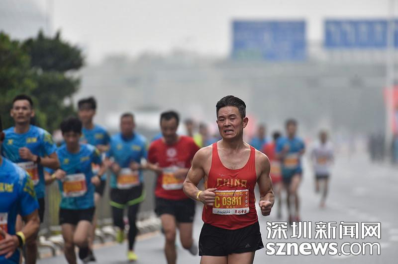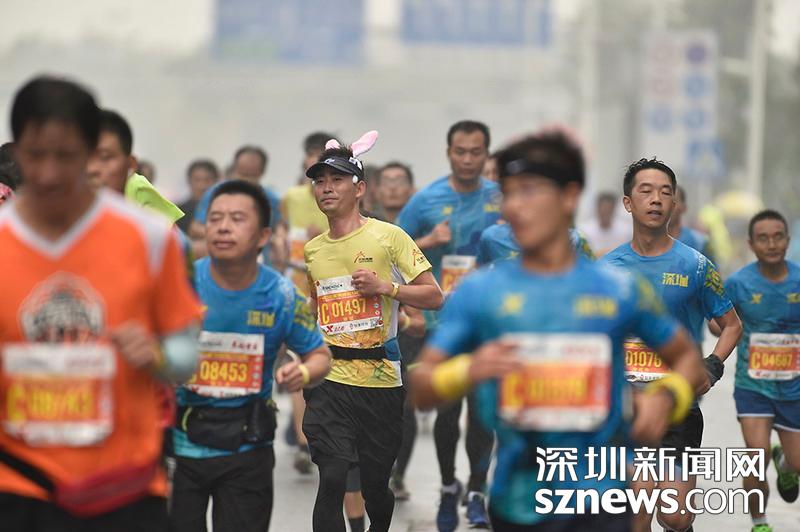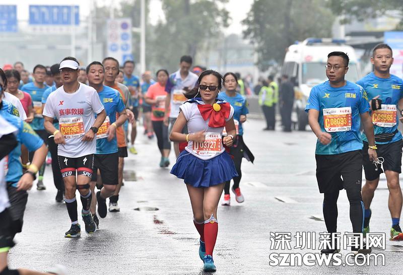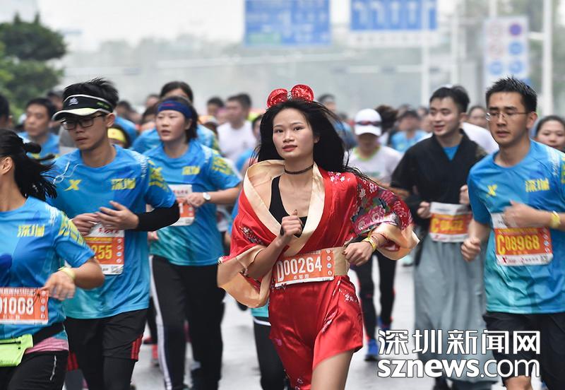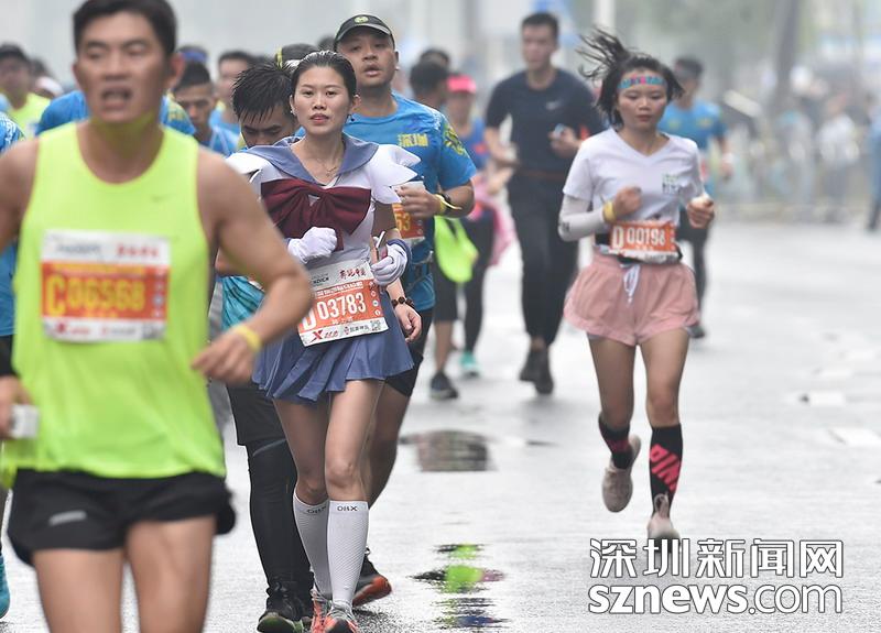 2018年12月16日,深圳國際馬拉松位于后海的折返點,三名選手正在向終點沖刺,跟其他選手不同,其中兩位選手選擇了自己搭配服裝參賽。