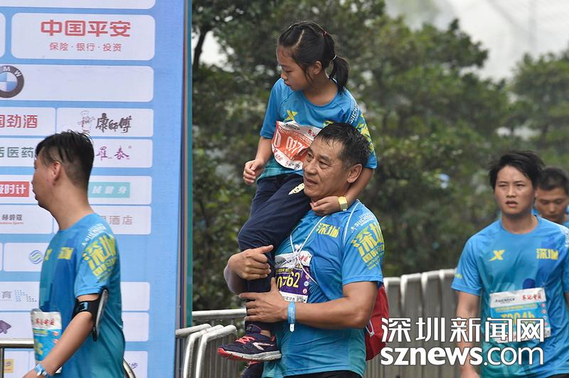 2018年12月16日,本屆馬拉松吸引了不少兒童參加,在深圳國際馬拉松位于后海的折返點,一位家長抱著孩子沖刺終點。