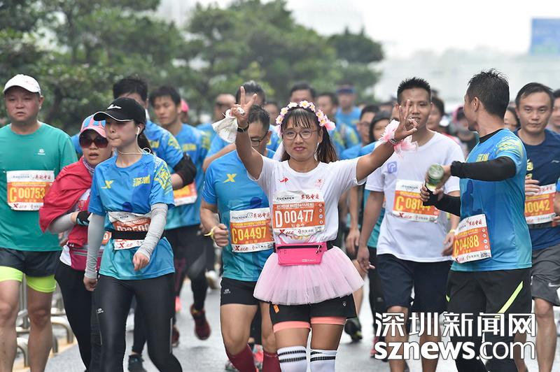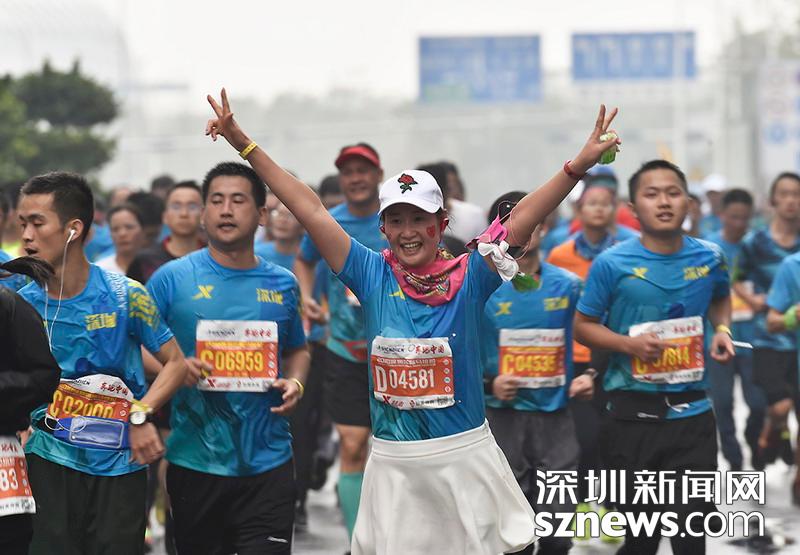 2018年12月16日,深圳國際馬拉松位于后海的折返點,即將抵達終點,一名選手擺出勝利姿勢。