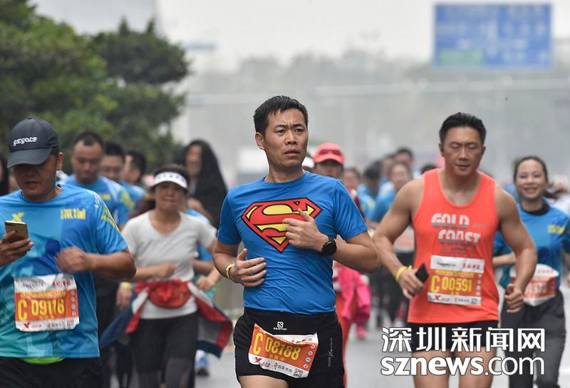 2018年12月16日,深圳國際馬拉松位于后海的折返點,一名身著超人標志短袖選手正在向終點沖刺。