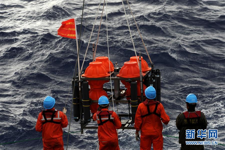 考察隊(duì)員在“沈括”號(hào)上布放“彩虹魚(yú)”著陸器(12月15日攝)。