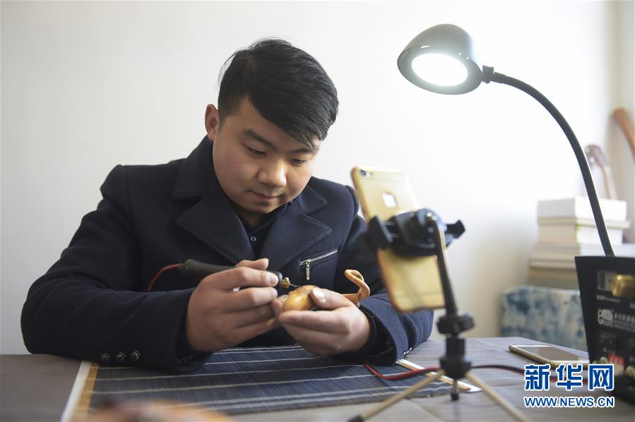 12月18日,劉征在自己的加工坊里通過手機直播展示葫蘆創(chuàng)作技藝。  新華社記者 魯鵬 攝
