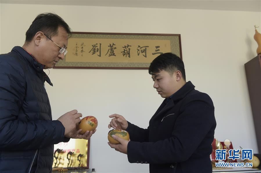 12月18日,劉征(右)在自己的加工坊里向來訪者介紹自己的葫蘆衍生品。  新華社記者 魯鵬 攝