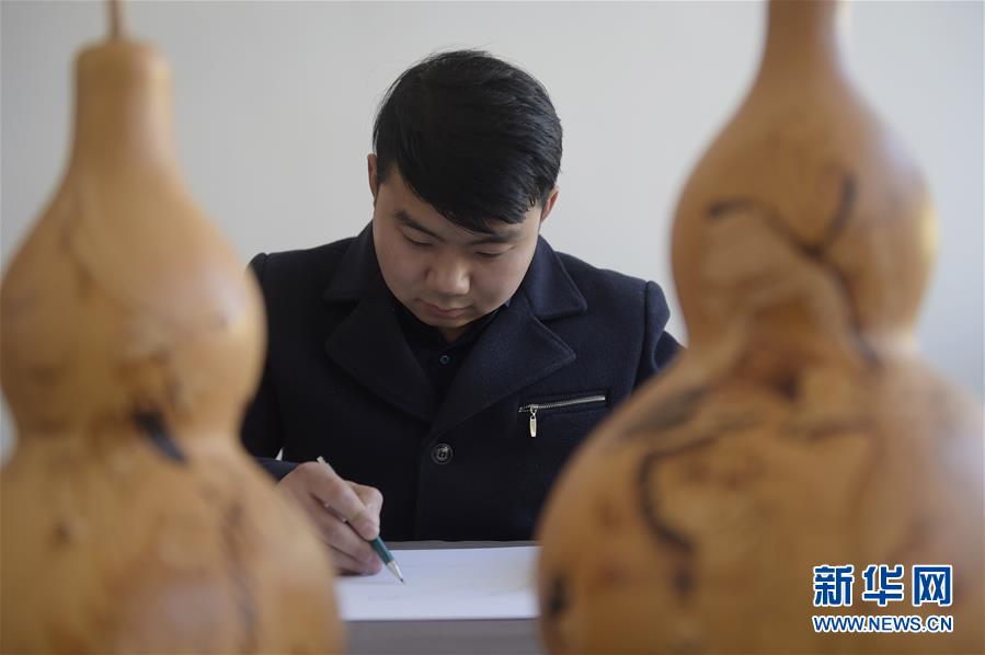 12月18日,劉征在自己的加工坊里設(shè)計葫蘆衍生品的草圖。 新華社記者 魯鵬 攝