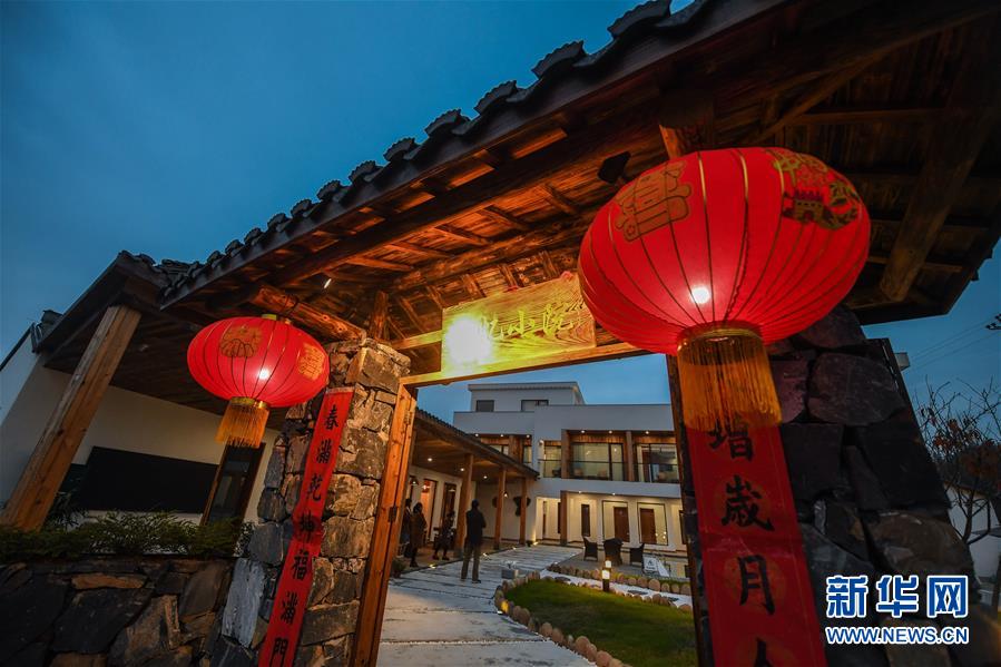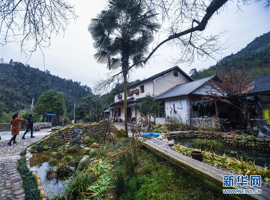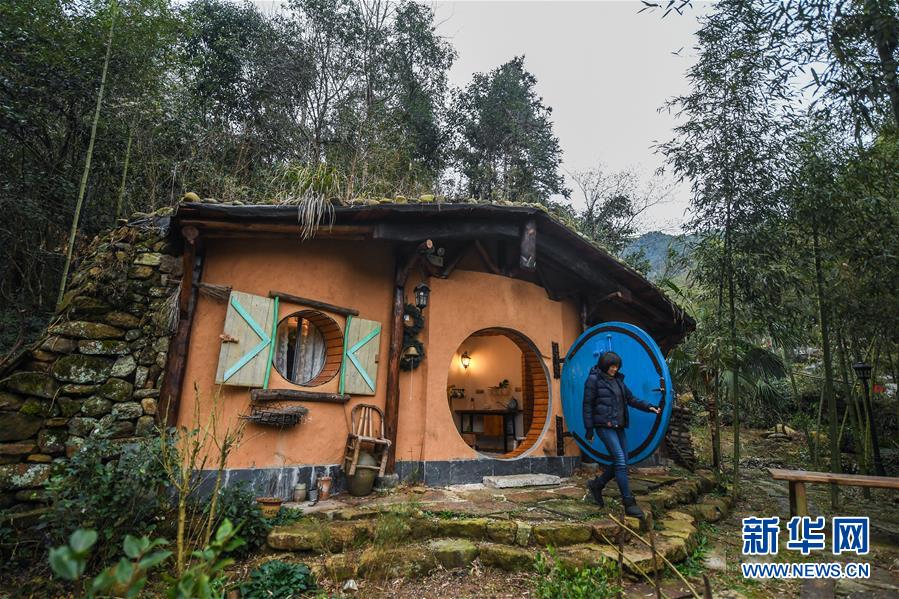 12月19日,客人走進(jìn)民宿“僻地寒樓”。該民宿共有7幢風(fēng)格各異的小屋分布在山坡上,頗具特色。河橋鎮(zhèn)青年張雁辭去了上海的工作,回到家鄉(xiāng)開(kāi)辦了這家民宿。  新華社記者 徐昱 攝