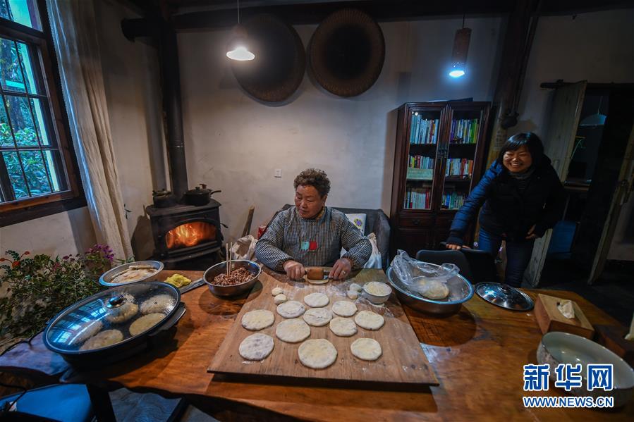 12月19日,民宿“僻地寒樓”的主人張雁(右)和媽媽在制作特色美食。該民宿共有7幢風(fēng)格各異的小屋分布在山坡上,頗具特色。河橋鎮(zhèn)青年張雁辭去了上海的工作,回到家鄉(xiāng)開(kāi)辦了這家民宿。  新華社記者 徐昱 攝