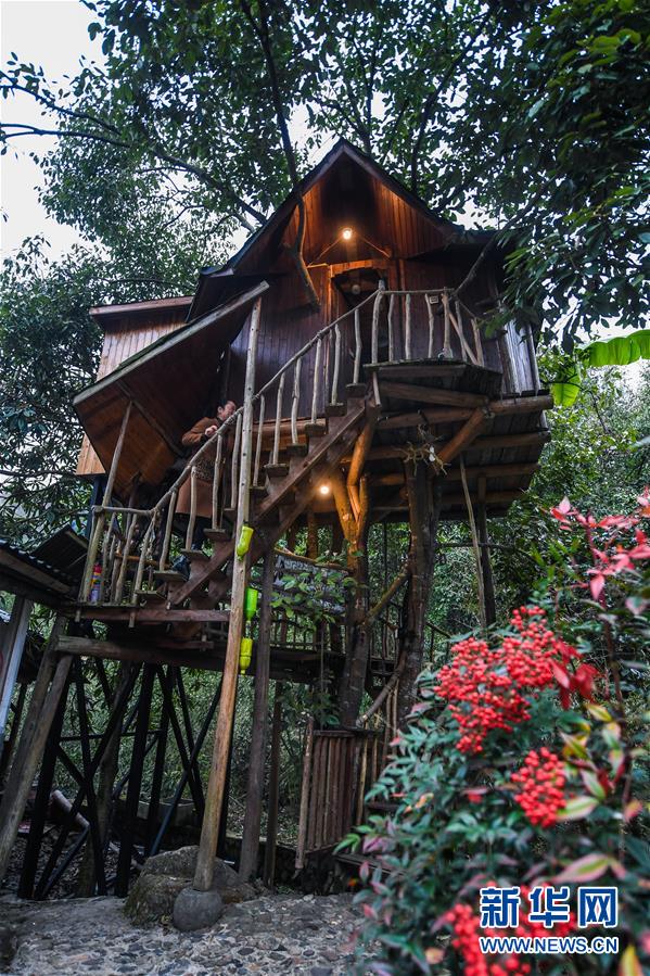 這是民宿“僻地寒樓”的一間樹(shù)屋(12月19日攝)。該民宿共有7幢風(fēng)格各異的小屋分布在山坡上,頗具特色。河橋鎮(zhèn)青年張雁辭去了上海的工作,回到家鄉(xiāng)開(kāi)辦了這家民宿。  新華社記者 徐昱 攝