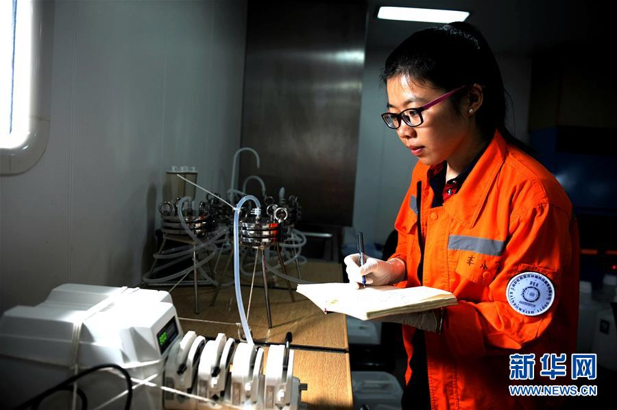 12月18日,來(lái)自中國(guó)科學(xué)院海洋研究所的博士后李小花在“沈括”號(hào)實(shí)驗(yàn)室工作。新華社記者 張建松 攝