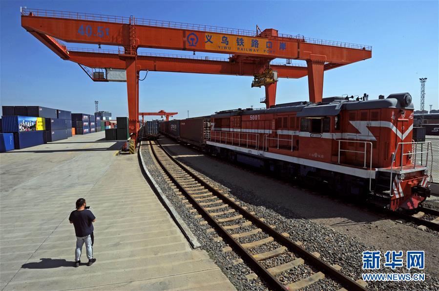 在浙江義烏鐵路西站,一列駛往西班牙馬德里的中歐班列(義烏)緩緩發(fā)車(chē)(10月27日攝)。 新華社記者 譚進(jìn) 攝