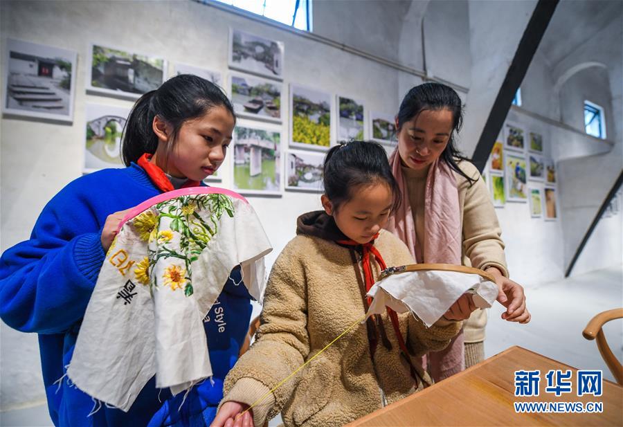 12月20日,學(xué)生在舊糧倉改建的“漾西書吧”內(nèi)學(xué)習(xí)傳統(tǒng)刺繡。  新華社記者 徐昱 攝