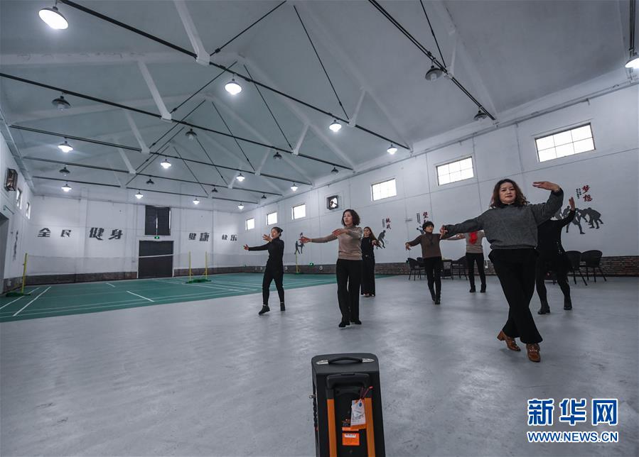 12月20日,村民們在舊糧倉改建的室內(nèi)體育館內(nèi)排練廣場舞。  新華社記者 徐昱 攝