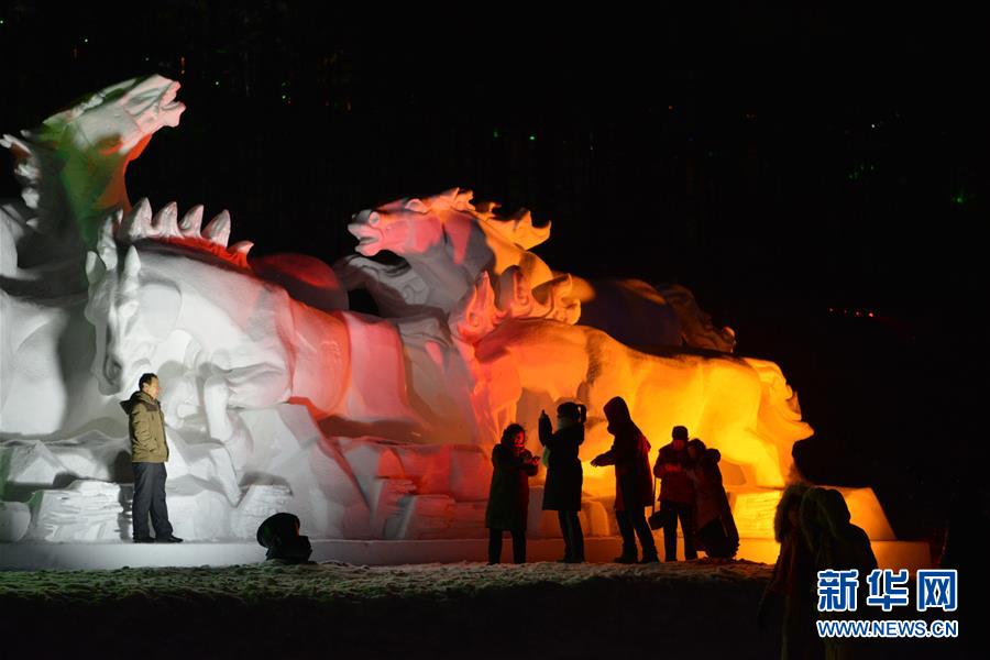 12月21日,游客在冰雪節(jié)開幕式上參觀雪雕。