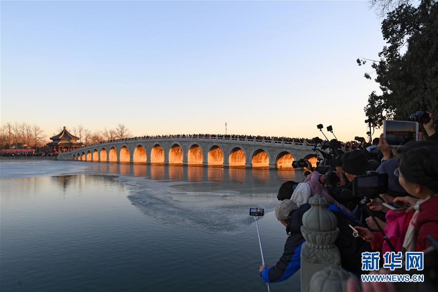 12月23日,游客和攝影愛好者在拍攝頤和園十七孔橋“金光穿洞”美景。 當(dāng)日,北京頤和園十七孔橋出現(xiàn)“金光穿洞”美景,吸引許多游客和攝影愛好者前來觀賞拍攝。 新華社記者陳曄華攝