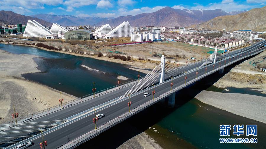 這是橫跨拉薩河的新建環(huán)城路納金大橋段(3月4日無人機拍攝)。  新華社記者 晉美多吉 攝