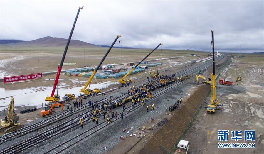 這是2017年7月26日無(wú)人機(jī)拍攝的青藏鐵路格爾木至拉薩段擴(kuò)能改造工程唐古拉車站撥接工作現(xiàn)場(chǎng)。 新華社記者 劉東君 攝