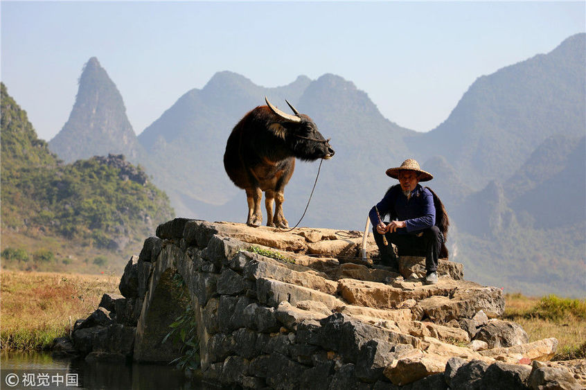 2018年12月17日,廣西桂林。用不到3年時(shí)間,農(nóng)民許修保愣是將自己家的水牛訓(xùn)練得走上了貓步,這讓來自全國(guó)各地的游客嘖嘖稱奇:你這么牛,維密天使情何以堪?憑著與水牛的聯(lián)袂演出,一個(gè)月下來,老許會(huì)有兩三萬的收入進(jìn)賬,佩服得左鄰右舍紛紛向他伸出了大拇指。棋簿紫/視覺中國(guó)