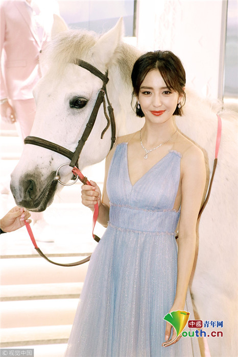 佟麗婭穿淡藍紗裙 與白馬合照甜美迷人仙氣十足